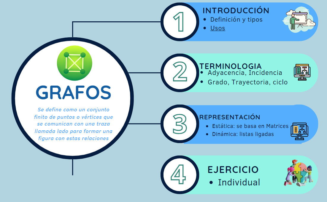 - Representación de relaciones: Los grafos se utilizan para representar y modelar relaciones complejas entre diferentes entidades, como redes sociales, estructuras moleculares, rutas de transporte, etc.
